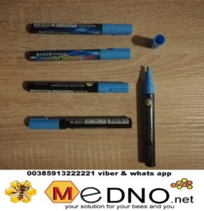 Model car paint or POSCA paint pens may be used to mark the queen. The identifying mark should be small, so that it does not cover any other part of the queen. A 1/16″ stick, lightly dipped in paint, is a good applicator. Generally, queens are marked before being introduced, but they can; however, be marked at any time. Paint should be given ample time to dry before the queen is released into the colony. In fact, queens may be purchased already marked by the queen producer. (Original text copied from Maine State Beekeepers Association, sourced from ohioline.osu.edu)