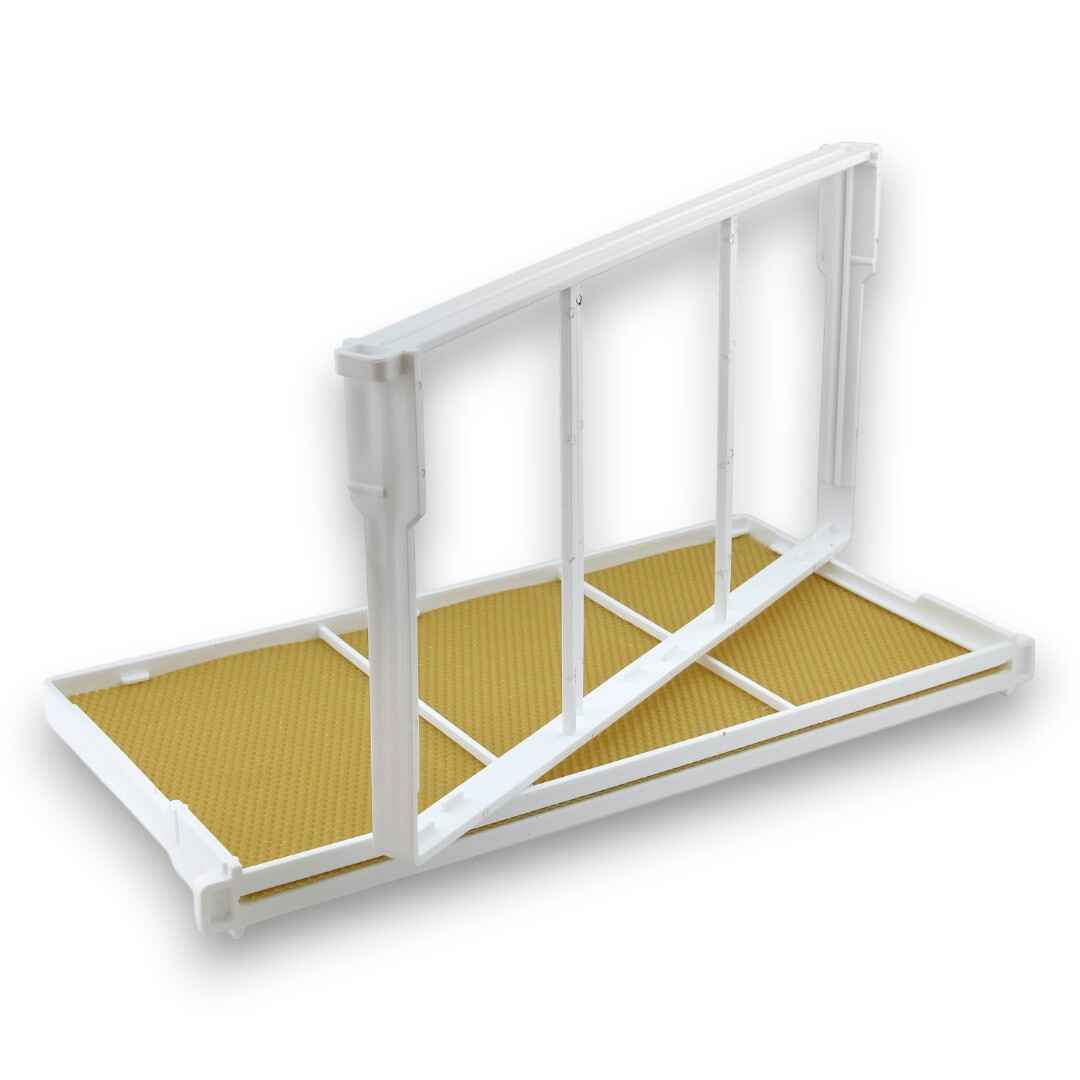 Okvir je izrađen od polipropilenske plastike, materijala koji je odobren za upotrebu u prehrambenoj industriji. Ova karakteristika osigurava sigurnost i dugotrajnost, dok istovremeno omogućuje lako čišćenje i održavanje. Preporučene dimenzije satne osnove za ovaj okvir iznose 225×434 mm, što osigurava optimalan kapacitet za sakupljanje meda i polaganje legla.