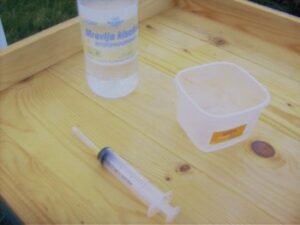 Koncentriranu mravlju kiselinu 85%-nu razblažim na 60%-nu tako što u plastičnu bocu od 1,5 litara sipam 294 ml destilirane vode a zatim u istu sipam litar mravlje kiseline ( NIKAKO OBRNUTO !!!!! , jer bi došlo do burne reakcije ) . Od zaštitne opreme imam gumene rukavice ( za pranje suđa ) i zaštitne naočale i kantu sa vodom u slučaju da se slučajno pošpricam mravljom kiselinom , kako bi ju brzo isprao .Mada moram priznati da je vrlo mala vjerojatnost da če se to dogoditi . Jer uvjek iz veče boce ljevam u manju posudu koja ima gore širi otvor , dok ovu veču bocu ponovo vratim u termo prenosni frižider. MRAVLJU KISELINU OBAVEZNO DAN PRIJE UPOTREBE STAVLJAM U DUBOKO ZAMRZAVANJE I POKUŠAVAM JU ŠTO DUŽE DRŽATI HLADNOM.Zato u prijenosni termo frižider dodajem zamrznute boce sa vodom . Kako se voda topi hladi dotatno mravlju kiselinu . A također i meni služi za osvježenje 🙂